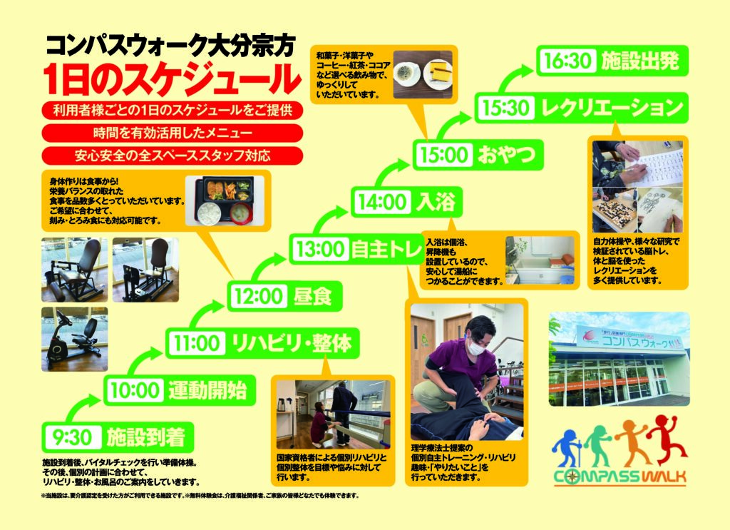 コンパスウォーク古国府は2025年8月1日オープンいたしました! 歩行訓練に特化した半日型デイサービス『コンパスウォーク古国府』 ご利用者様の在宅生活をサポートしていきます。 見学相談会随時受付中! ☎097-594-5577