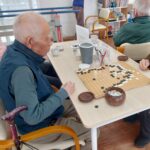 職員と一緒に平行棒で運動されている方、囲碁を楽しまれている方。