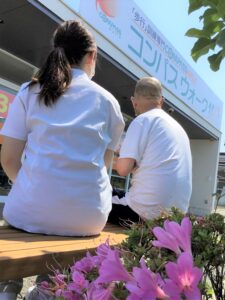 お天気の良い日は、施設の前を散歩されるご利用者さんもいらっしゃいます。歩いた後は施設の前にあるベンチで一休み♡