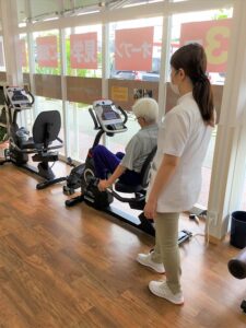 いろいろなマシーンがあるコンパスウォークですが、体力向上には自転車型エルゴメーターと車椅子にすわったまま足漕ぎができるマーチがもってこいです♪ご利用者さまの体力に応じて理学療法士が実施時間や負荷量を考えさせていただいております! by y🌼